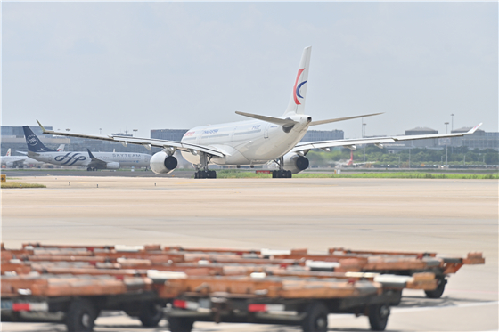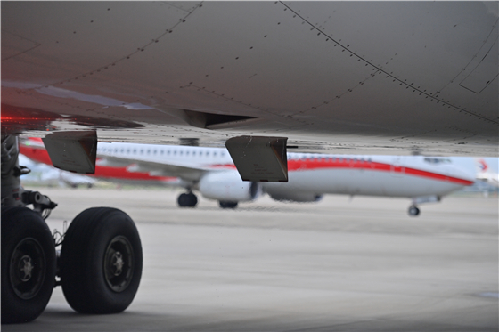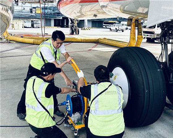 東航機務正在為一架剛落地的客機機輪通風散熱