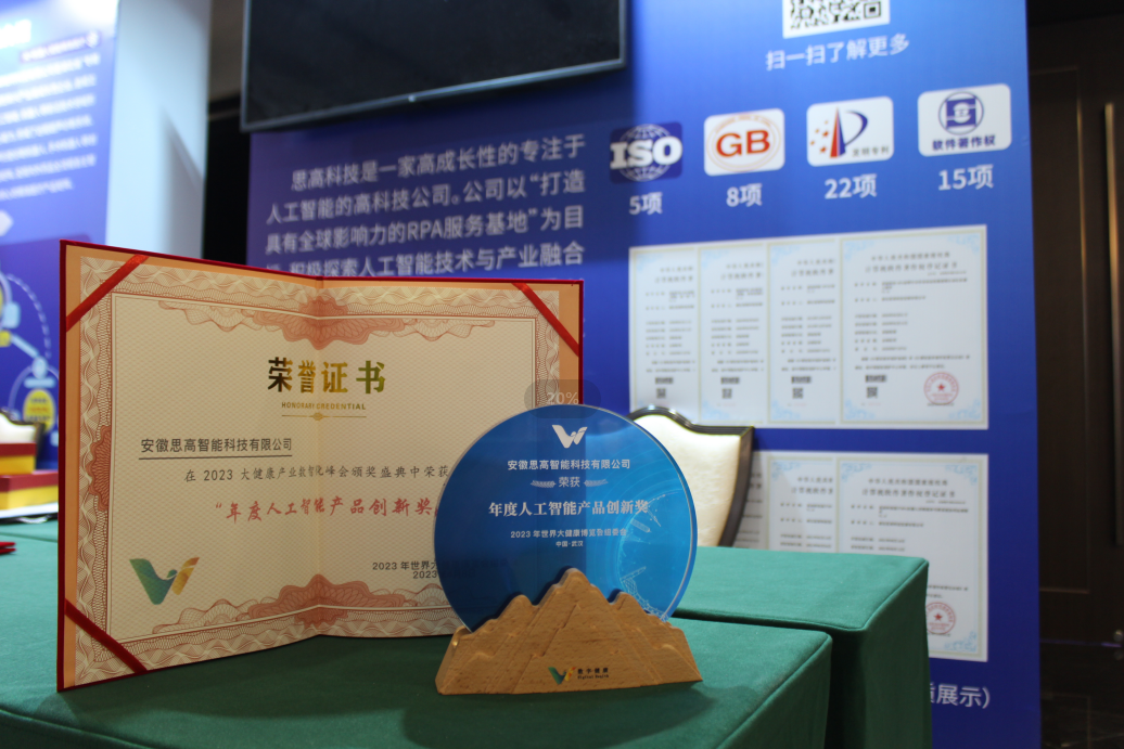 在頒獎(jiǎng)環(huán)節(jié)中,思高科技憑借公司核心人工智能軟件產(chǎn)品——“RPA+AI數(shù)字員工”的產(chǎn)品實(shí)力和技術(shù)創(chuàng)新榮獲“年度人工智能產(chǎn)品創(chuàng)新獎(jiǎng) ”,思高科技董事長(zhǎng)付磊憑借在助推大健康產(chǎn)業(yè)數(shù)字化轉(zhuǎn)型中的突出貢獻(xiàn)榮獲“年度大健康產(chǎn)業(yè)數(shù)字化創(chuàng)新人物獎(jiǎng)”,獎(jiǎng)項(xiàng)的獲得不僅是對(duì)公司人工智能技術(shù)的實(shí)力認(rèn)可,也是對(duì)公司在大健康產(chǎn)業(yè)的持續(xù)創(chuàng)新和進(jìn)步的肯定。