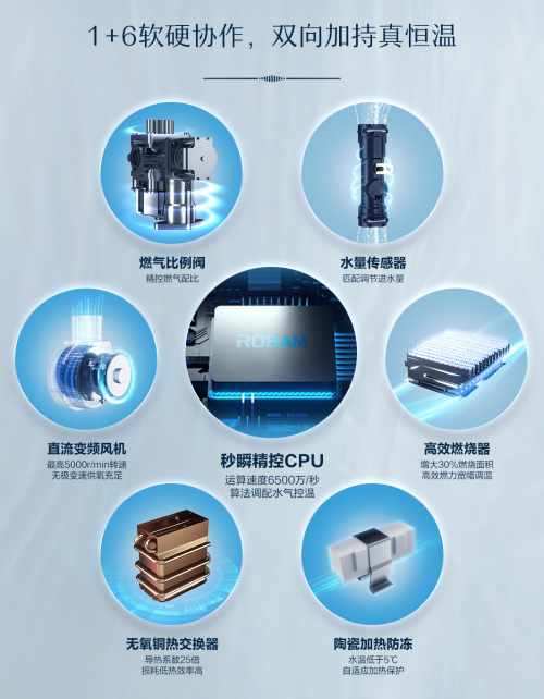 硬件上,【川】系列燃?xì)鉄崴鱄T730搭載秒瞬精控CPU,內(nèi)置全新升級(jí)的PID智能算法,可達(dá)6500萬/秒超速運(yùn)算,精準(zhǔn)計(jì)算水氣配比,使燃?xì)獗壤y和水量傳感器快速響應(yīng),迅捷精控持久恒溫。水流量傳感器,可精準(zhǔn)調(diào)節(jié)進(jìn)出口水量,在CPU的配合下實(shí)現(xiàn)水溫恒定;燃?xì)獗壤y,實(shí)時(shí)精控燃?xì)庥昧?#xff0c;高能效穩(wěn)定控溫;高效燃燒器,創(chuàng)新增氧V型火排,增大30%燃燒面積,增強(qiáng)89.68%燃燒效率,削弱15%運(yùn)行噪音,分段穩(wěn)然技術(shù)讓小火中火大火靈活調(diào)控,實(shí)現(xiàn)35-60℃寬幅調(diào)溫。直流變頻風(fēng)機(jī),最高5000r/min轉(zhuǎn)速無極變速高效供氧充足。高效無氧銅熱交換器,除了導(dǎo)熱性耐腐蝕性出色,還具備更強(qiáng)的熱沖擊性能。陶瓷加熱防凍,當(dāng)水溫低至5℃,四個(gè)陶瓷加熱器便會(huì)啟動(dòng)加熱保護(hù),無懼國(guó)內(nèi)高寒天氣,-20℃也能安心熱浴。1+6的軟硬件協(xié)作,便可讓【川】系列燃?xì)鉄崴鱄T730輸出澎湃熱水,給予你舒適的沐浴體驗(yàn)與不間斷的溫暖關(guān)懷。