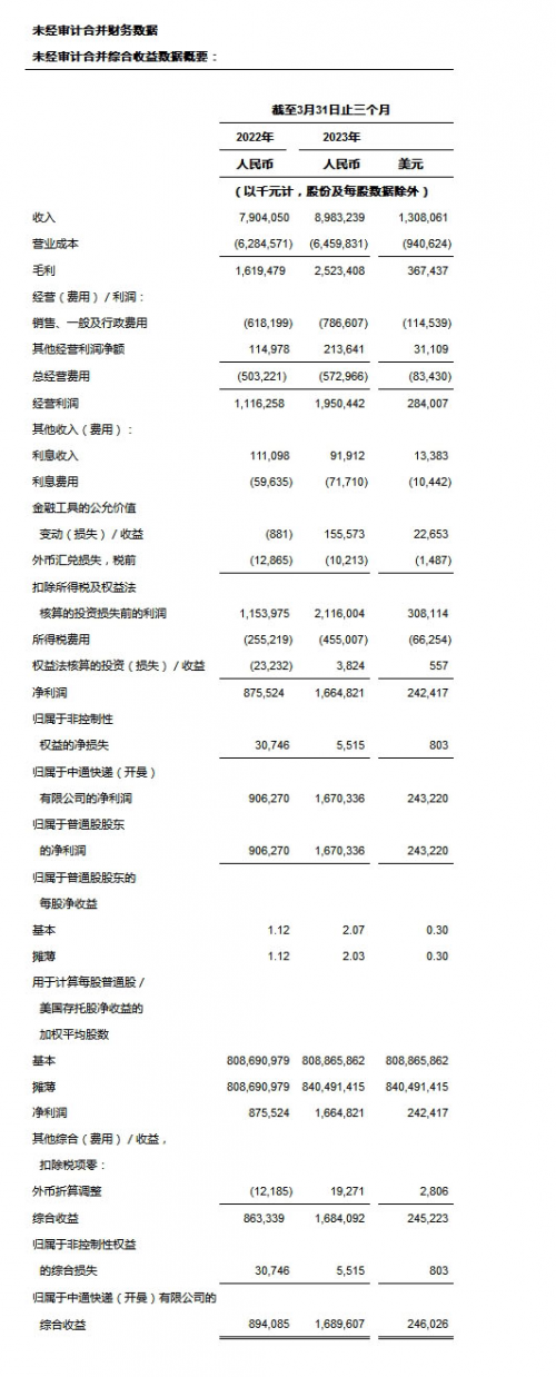 ?收入總額 為人民幣8,983.2百萬(wàn)元(1,308.1百萬(wàn)美元),較2022年同期的人民幣7,904.1百萬(wàn)元增長(zhǎng)13.7%。核心快遞服務(wù)收入較2022年同期增長(zhǎng)16.1%,該增長(zhǎng)是由于包裹量增長(zhǎng)20.5%及單票價(jià)格下降3.7%的綜合影響所致。貨運(yùn)代理服務(wù)收入較2022年同期減少41.8%,該減少主要是由于全球經(jīng)濟(jì)疲弱導(dǎo)致跨境電商需求和定價(jià)下降所致。物料銷(xiāo)售收入主要由打印電子面單所需的熱敏紙銷(xiāo)售收入組成,同比增長(zhǎng)30.8%,該等增長(zhǎng)與包裹量增長(zhǎng)趨勢(shì)吻合。其他收入主要由金融貸款業(yè)務(wù)組成。