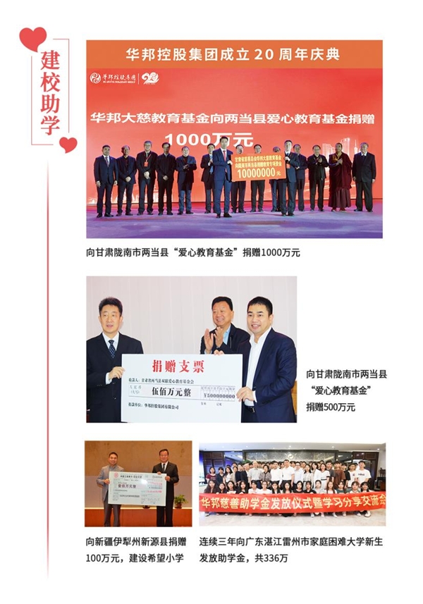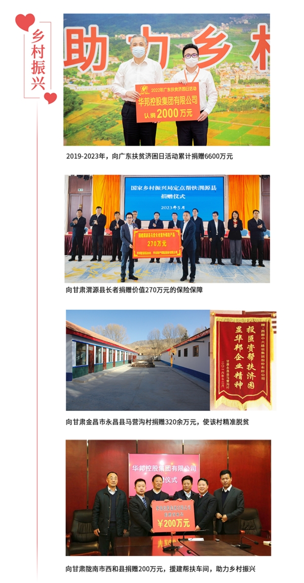 利合一,回報社會。23年來,華邦控股集團不斷發(fā)展壯大,實現(xiàn)高質(zhì)量發(fā)展,得益于時代,得益于黨和政府及社會各界的關(guān)心與支持。助力鄉(xiāng)村振興,僅是華邦履行社會責任的縮影。華邦作為廣東省百強民營企業(yè),始終心懷感恩,勇于擔當,用心用情投身于各項慈善公益事業(yè),回饋社會。迄今為止,華邦在鄉(xiāng)村振興、建校助學、賑災援助等公益領(lǐng)域累計捐款捐物數(shù)億元。