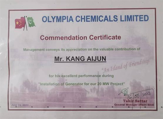 值得一提的是,發(fā)電機(jī)各項(xiàng)數(shù)據(jù)經(jīng)過業(yè)主檢測基本都在中間公差,巴基斯坦OLYMPIA CHEMICALS公司管理層對舜云互聯(lián)提供的服務(wù)和售后服務(wù)人員所展現(xiàn)出的精湛的技術(shù),高度的責(zé)任感和使命感表示高度認(rèn)可,并頒發(fā)了《表揚(yáng)證書》。
