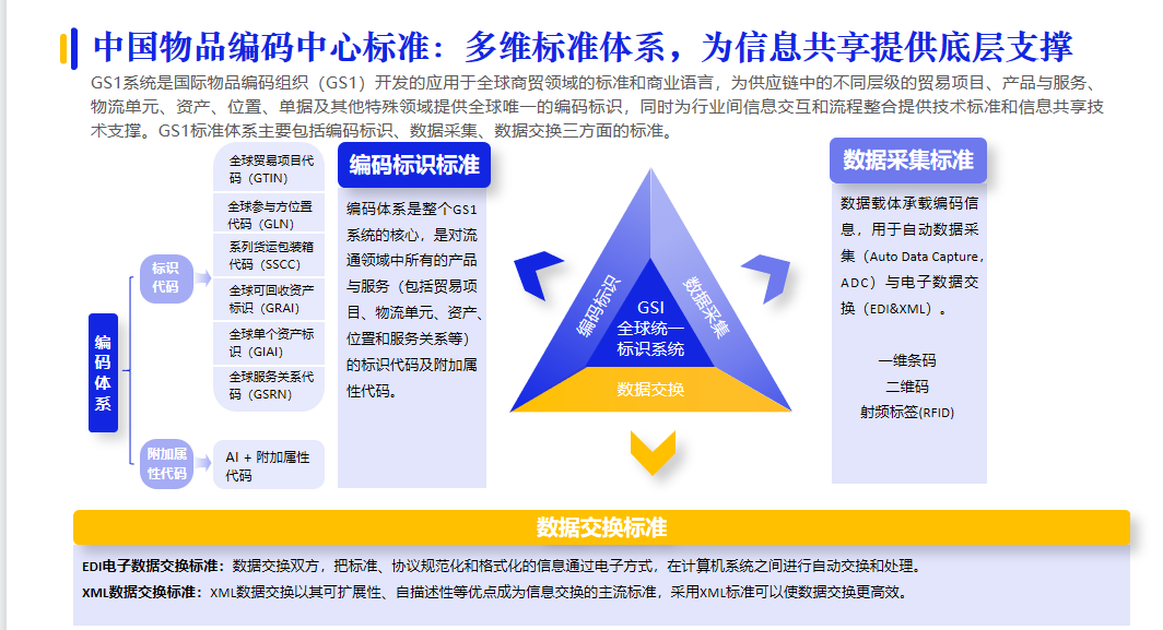 統(tǒng)一物品編碼標(biāo)準(zhǔn)一直是采購供應(yīng)鏈領(lǐng)域的重點(diǎn)和難點(diǎn)。中國物品編碼中心的GS1系統(tǒng)是國際物品編碼組織(GS1)開發(fā)的應(yīng)用于全球商貿(mào)領(lǐng)域的標(biāo)準(zhǔn)和商業(yè)語言,為供應(yīng)鏈中的不同層級(jí)的貿(mào)易項(xiàng)目、產(chǎn)品與服務(wù)、物流單元、資產(chǎn)、位置、單據(jù)及其他特殊領(lǐng)域提供全球唯一的編碼標(biāo)識(shí),同時(shí)為行業(yè)間信息交互和流程整合提供技術(shù)標(biāo)準(zhǔn)和信息共享技術(shù)支撐。