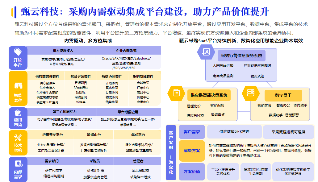 再例如,甄云科技通過全方位考慮采購的需求部門、采購者、管理者的根本需求來定制化開放平臺(tái),實(shí)現(xiàn)供方資源接入和企業(yè)內(nèi)部系統(tǒng)的全局協(xié)同。