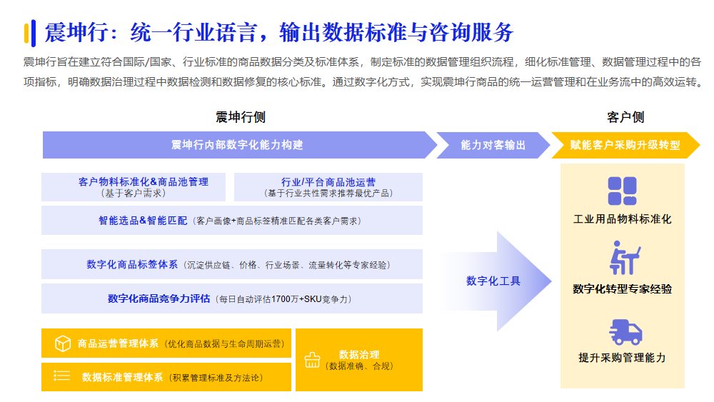 為企業(yè)提供場(chǎng)景、行業(yè)適配的產(chǎn)品與服務(wù)是供應(yīng)商的基礎(chǔ)能力??梢越柚鶤I等數(shù)字化技術(shù)服務(wù),基于場(chǎng)景梳理的標(biāo)準(zhǔn)化實(shí)現(xiàn)商品智能匹配,已經(jīng)成為供應(yīng)商服務(wù)升級(jí)的方向。例如:震坤行通過建立國際/國家、行業(yè)標(biāo)準(zhǔn)的商品數(shù)據(jù)分類及標(biāo)準(zhǔn)體系,明確數(shù)據(jù)治理過程中數(shù)據(jù)檢測(cè)和數(shù)據(jù)修復(fù)的核心標(biāo)準(zhǔn),再基于場(chǎng)景梳理,建立數(shù)字化商品標(biāo)簽體系,實(shí)現(xiàn)震坤行商品的統(tǒng)一運(yùn)營管理和在業(yè)務(wù)流中的高效運(yùn)轉(zhuǎn)。