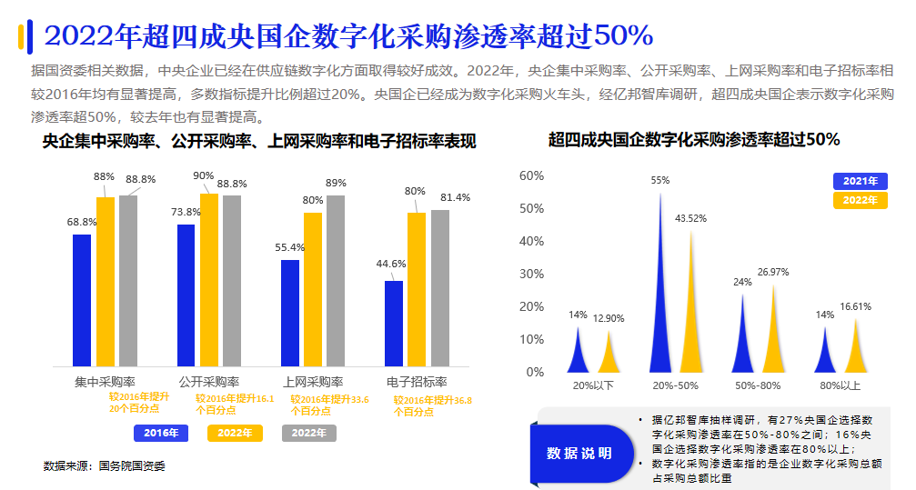 央國企在我國企業(yè)采購數(shù)字化進(jìn)程中的火車頭效應(yīng)越發(fā)明顯。據(jù)億邦智庫調(diào)研,超四成央國企表示數(shù)字化采購滲透率已經(jīng)超過50%;形成了央國企先行,引發(fā)供應(yīng)鏈各環(huán)節(jié)企業(yè)參與數(shù)字化創(chuàng)新變革的發(fā)展態(tài)勢(shì)。