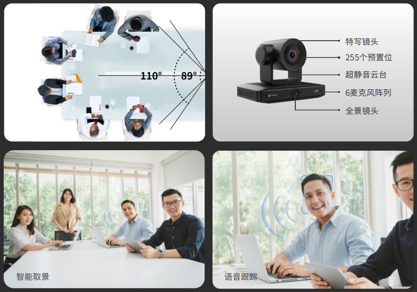 攝像系統(tǒng)由12倍光學(xué)變焦特寫鏡頭和110°大廣角的全景鏡頭組成,特寫鏡頭可視角達(dá)89°,可將畫面無損放大至12倍,加上自動(dòng)對(duì)焦,不僅能捕捉所有參會(huì)人的表情和動(dòng)作,會(huì)議室中的文件和白板內(nèi)容都能在遠(yuǎn)端輕松觀看。同時(shí),作為一款會(huì)議云臺(tái)攝像頭,它能通過6顆麥克風(fēng)陣列,鎖定發(fā)言人位置,電機(jī)實(shí)時(shí)穩(wěn)定安靜快速地運(yùn)行轉(zhuǎn)動(dòng)到當(dāng)前發(fā)言人,覆蓋會(huì)議室多個(gè)角度,讓遠(yuǎn)程的參會(huì)人更具沉浸感和參與感。