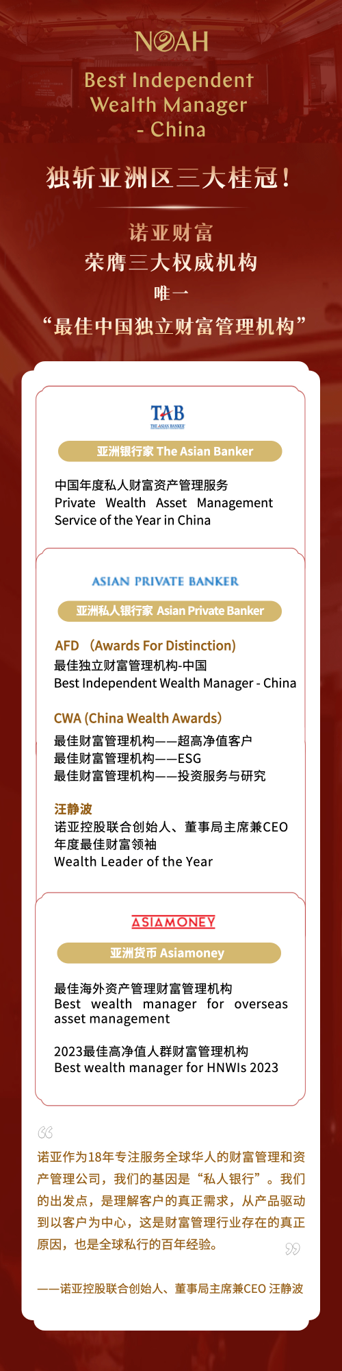 《亞洲貨幣》、《亞洲私人銀行家》、《亞洲銀行家》均為亞洲金融領(lǐng)域具有廣泛影響力的權(quán)威評選機(jī)構(gòu),扎針對亞洲迅速發(fā)展的私人銀行、家族辦公室和財(cái)富管理行業(yè),提供獨(dú)立、權(quán)威、不可或缺的資訊和評論。多項(xiàng)大獎(jiǎng)被業(yè)內(nèi)譽(yù)為奧斯卡級的獎(jiǎng)項(xiàng),主要為表彰機(jī)構(gòu)過去一年在資產(chǎn)管理和財(cái)富管理領(lǐng)域的卓越表現(xiàn),此次獲獎(jiǎng),一方面是權(quán)威機(jī)構(gòu)對諾亞財(cái)富在投研能力、資產(chǎn)管理規(guī)模、客戶增長、ESG等關(guān)鍵數(shù)據(jù)指標(biāo)表現(xiàn)的肯定;另一方面也彰顯了諾亞財(cái)富在中國市場日漸崛起的行業(yè)規(guī)模以及品牌發(fā)展歷程上來自客戶及合作伙伴的信任。體現(xiàn)了諾亞在財(cái)富管理行業(yè)的地位,也是國際專業(yè)機(jī)構(gòu)對諾亞持續(xù)不斷創(chuàng)新轉(zhuǎn)型、破局變革、提供優(yōu)質(zhì)產(chǎn)品和專業(yè)服務(wù)的認(rèn)可和肯定。據(jù)了解,由國際權(quán)威財(cái)經(jīng)雜志《亞洲銀行家》舉辦的系列獎(jiǎng)項(xiàng)計(jì)劃是目前全球最嚴(yán)格、最具聲望和最透明的金融服務(wù)獎(jiǎng)項(xiàng)之一,其評選建立在公開公正、透明中立的基礎(chǔ)上,經(jīng)由亞洲銀行家國際研究團(tuán)隊(duì)和評審顧問團(tuán)評估調(diào)查、訪談評選而出。此次評選覆蓋了國際范圍內(nèi)超過30多個(gè)國家200余家金融機(jī)構(gòu)。