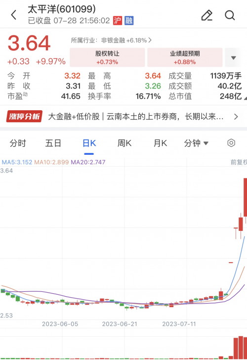 7月28日,太平洋證券再次漲停,截至收盤,成交40.24億元,換手率為16.71%,買一封單107.42萬(wàn)手,以當(dāng)日收盤價(jià)3.64元計(jì)算,約3.91億元。太平洋錄得“四天三漲?!?#xff0c;近4個(gè)交易日上漲36.84%,累計(jì)成交118.93億元。最新總市值為248.1億元,較7月23日收盤市值增加66.8億元。