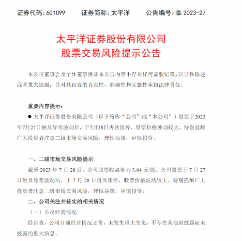 7月28日,太平洋證券發(fā)布股票交易風(fēng)險(xiǎn)提示公告,公司股票于2023年7月27日觸及異常波動(dòng)后,于7月28日再次漲停,股票價(jià)格波動(dòng)較大,特別提醒廣大投資者注意二級(jí)市場(chǎng)交易風(fēng)險(xiǎn),理性決策,審慎投資。