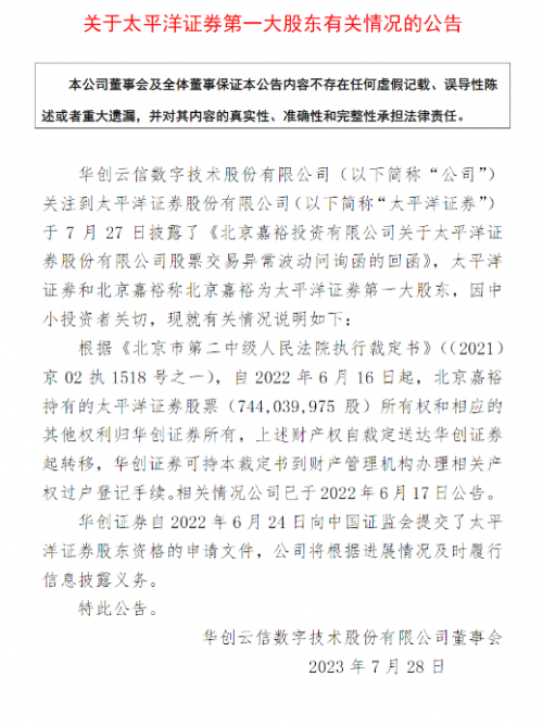 7月28日,華創(chuàng)云信發(fā)布公告稱,根據(jù)法院執(zhí)行裁定書,自2022年6月16日起,北京嘉裕持有的太平洋證券股票7.44億股所有權(quán)和相應(yīng)的其他權(quán)利歸華創(chuàng)證券所有,上述財(cái)產(chǎn)權(quán)自裁定送達(dá)華創(chuàng)證券起轉(zhuǎn)移,華創(chuàng)證券可持本裁定書到財(cái)產(chǎn)管理機(jī)構(gòu)辦理相關(guān)產(chǎn)權(quán)過(guò)戶登記手續(xù)。