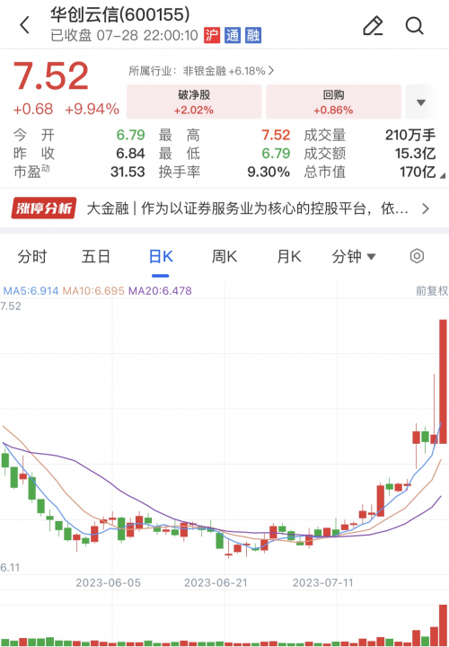 作為太平洋證券7.44億股股權(quán)的收購(gòu)方,華創(chuàng)證券母公司華創(chuàng)云信(原華創(chuàng)陽(yáng)安)同樣出現(xiàn)大漲,截至28日收盤,日內(nèi)成交15.28億元,換手率為9.3%,買一封單為9.23萬(wàn)手,近4個(gè)交易日累計(jì)上漲14.81%,最新市值為170.06億元。