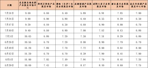 從全國來看,當(dāng)前國內(nèi)夏季水果供應(yīng)較為充足,近期國內(nèi)水果交易價格整體處于較低水平,本期農(nóng)業(yè)農(nóng)村部監(jiān)測的6種重點(diǎn)監(jiān)測水果價格跌幅收窄。截至7月31日,農(nóng)業(yè)農(nóng)村部監(jiān)測的6種水果(富士蘋果、巨峰葡萄、香蕉、菠蘿、西瓜、鴨梨)批發(fā)均價報7.35元/公斤,較7月24日下跌0.94%。