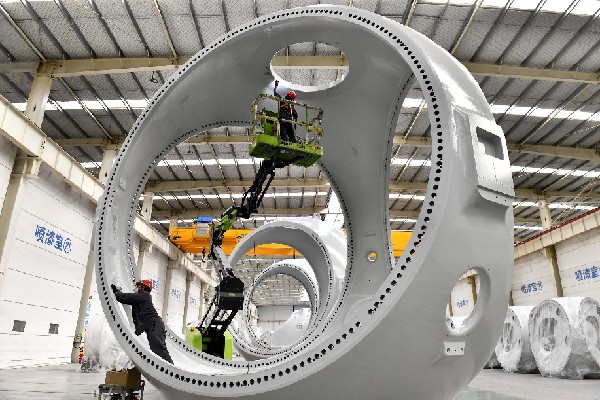 在山東省惠民縣風(fēng)電裝備產(chǎn)業(yè)基地涂裝車間,工作人員對風(fēng)電輪轂進(jìn)行涂裝。