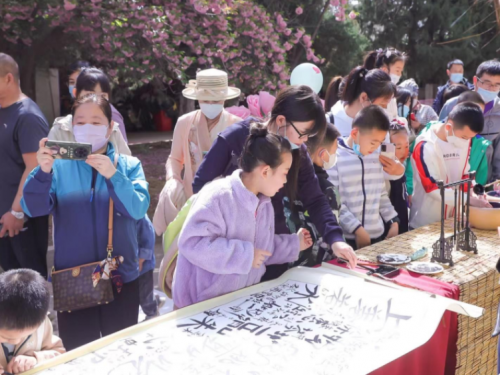來賓們?cè)谫p櫻的同時(shí)紛紛錄制有聲明信片“我想對(duì)黨說”,體驗(yàn)各式手作、風(fēng)箏制作、DIY團(tuán)扇制作、漢服秀等?!霸搅_衫袂迎春風(fēng),玉刻麒麟腰帶紅?!贝荷ㄏ?#xff0c;飄逸的裙裾、精致的簪花,中華傳統(tǒng)服飾之美與絢爛多姿的國(guó)潮風(fēng)交相輝映,在水墨香中感受漢字書法的魅力所在,在詩詞之美中,領(lǐng)略詩意人生的寫照、家國(guó)情懷的寄托,傳承詩詞文化,涵養(yǎng)民族精神。