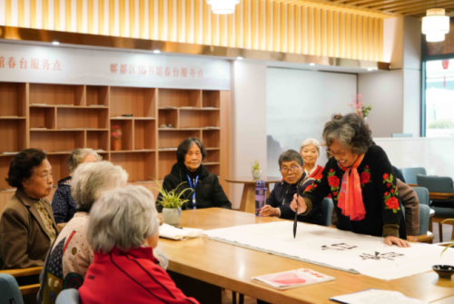 活動中,另一位80多歲的阿姨現場書寫了“春臺書香”四個大字,寄語書香社區(qū)的營建。