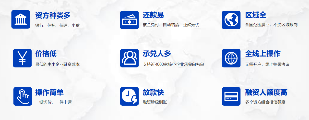 3、融資額度高、到期還款易 :融資人享受多個資方組合授信額度,核心企業(yè)兌付,到期自動結清、還款無憂。