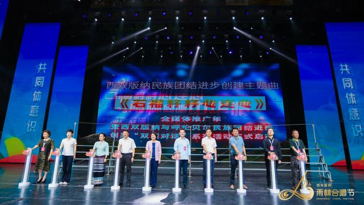 開幕式上,南疆與北疆,西雙版納與呼倫貝爾,以“中華民族一家親,同心共筑中國夢”為總目標(biāo),以首屆西雙版納雨林合唱節(jié)為契機,開啟兩地“雙城(民族團結(jié))對話”,打造“民族團結(jié)+文化旅游”創(chuàng)新發(fā)展模式。中共西雙版納州委副書記、州委統(tǒng)戰(zhàn)部部長王嘉玲等領(lǐng)導(dǎo)為“西雙版納民族團結(jié)進步創(chuàng)建主題曲《石榴籽籽心連心》全媒體推廣年、西雙版納與呼倫貝爾民族團結(jié)進步創(chuàng)建“雙城對話”系列活動”進行了創(chuàng)意啟動。
