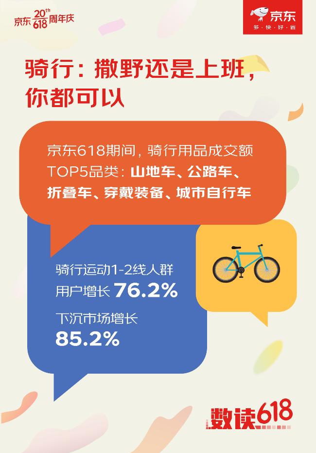 京東騎行數(shù)據(jù)顯示,騎行在今年應(yīng)該可以拿下增速最高的戶外類目頭牌。其中分(專業(yè)、非專業(yè)、泛潮)公路車、山地車、青少年自行車、電助力車、城市通勤自行車等,品類十分豐富,能很好地滿足騎行達(dá)人們的“步履不?!钡目犰胚\(yùn)動生活。