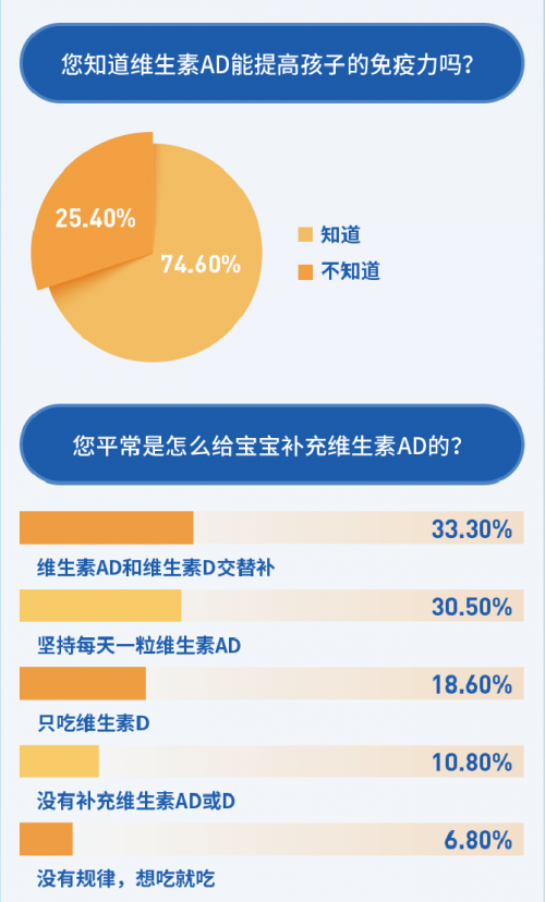 調(diào)查報(bào)告還顯示,雖然7成的家長(zhǎng)認(rèn)可維生素AD對(duì)提高免疫力的作用,但有7成的家長(zhǎng)用錯(cuò)了方法,比如選擇AD和D交替補(bǔ)、只補(bǔ)D不補(bǔ)A、補(bǔ)補(bǔ)停停等。專家提醒,家長(zhǎng)一定要重視孩子日常營(yíng)養(yǎng)的攝入,堅(jiān)持每天補(bǔ)充維生素AD是最佳方案。