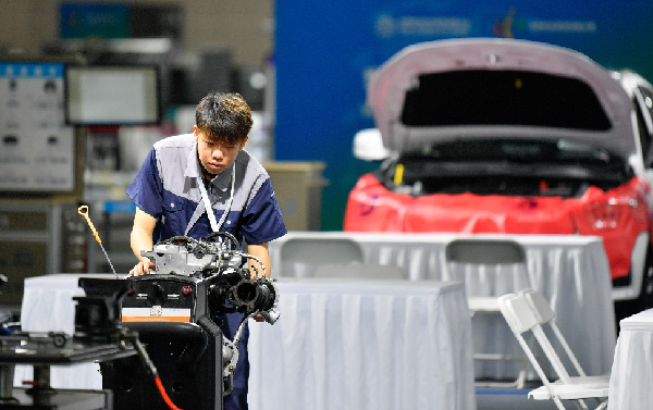 在天津舉行的首屆世界職業(yè)院校技能大賽上,參賽選手在進行發(fā)動機拆卸維護展演。