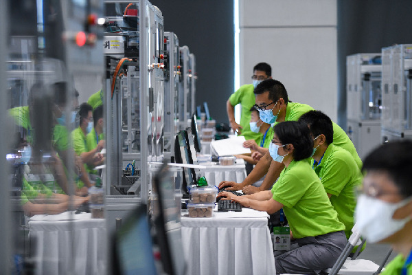 在深圳舉行的全國工業(yè)和信息化技術技能大賽決賽上,選手在工業(yè)大數據算法項目比賽中操作。