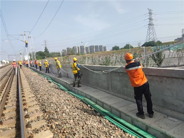 隨著作業(yè)人員默契配合下,起錨、放線、滑輪懸掛固定、落錨等各個工序有序推進,中國中鐵電氣化局運管公司上海維管處合肥維管段橫跨包公大道供電線恢復(fù)架設(shè),標(biāo)志著淮南線接觸網(wǎng)遷改施工進入最后階段。
