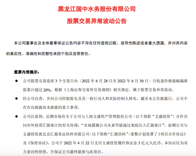 6月30日晚間,國(guó)中水務(wù)發(fā)布《股票交易異常波動(dòng)公告》稱(chēng),公司注意到,近期市場(chǎng)有關(guān)于公司與文盛投資合作共同對(duì)外投資匯源果汁的有關(guān)傳聞:“市場(chǎng)猜測(cè)公司未來(lái)可能通過(guò)重組注入?yún)R源果汁”。經(jīng)公司核查如下:前期公司與文盛投資就匯源飲料重整計(jì)劃簽署了《項(xiàng)目合作協(xié)議》及《保密協(xié)議》,公司于2022年4月22日支付文盛投資履約保證金3億元,本協(xié)議僅為雙方意向性投資,不保證公司最終能參與此項(xiàng)目。
