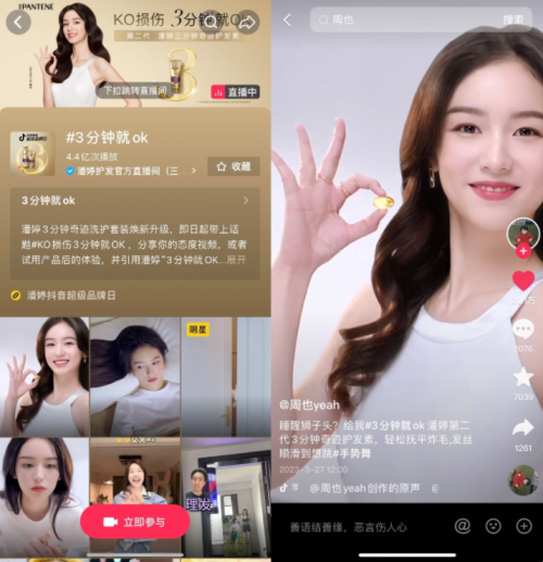 回顧此次活動,抖音電商超級品牌日深入洞察生活方式變化,結(jié)合潘婷品牌理念和新品發(fā)布,經(jīng)由明星與頭部達(dá)人參與#3分鐘就OK 挑戰(zhàn)賽、明星出席發(fā)布會、抖音微博熱搜引流、站內(nèi)主播實力帶貨,基于抖音全域興趣電商生態(tài)優(yōu)勢,幫助品牌實現(xiàn)品效合一。