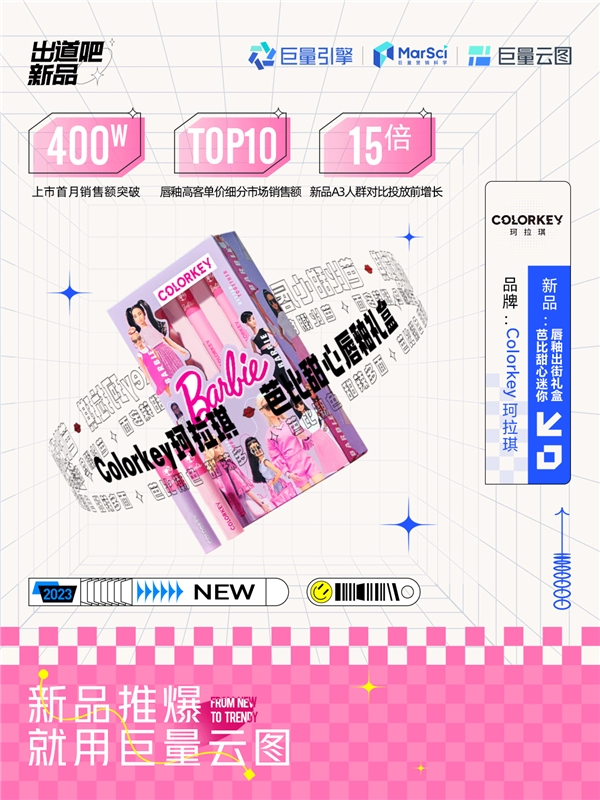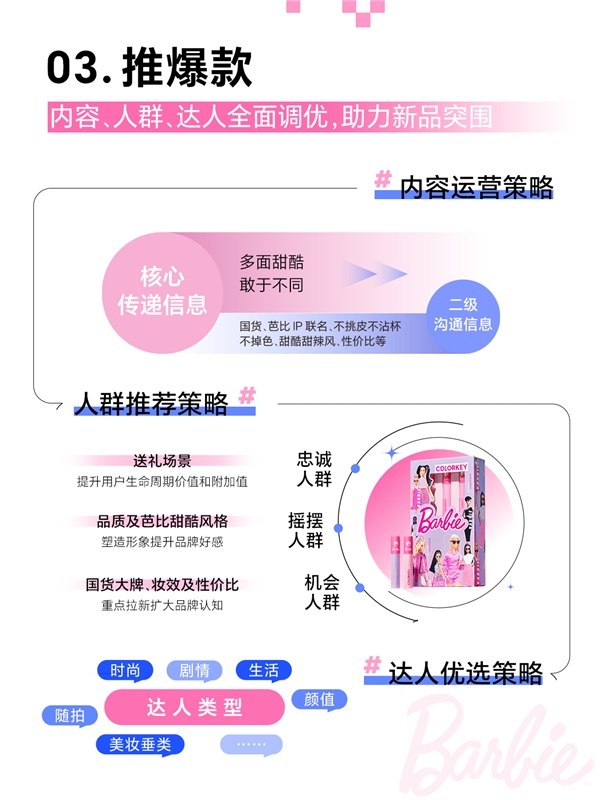 適用于送禮、提升品牌調(diào)性、具有高客單價(jià)特征的“芭比禮盒”新品,符合品牌風(fēng)格特點(diǎn)和消費(fèi)需求,適宜作為品牌形象款進(jìn)行主推和破圈?;诖?珂拉琪打造高客單價(jià)“芭比甜心迷你唇釉出街禮盒”作為618活動(dòng)的主推新品,強(qiáng)力吸引目標(biāo)人群。