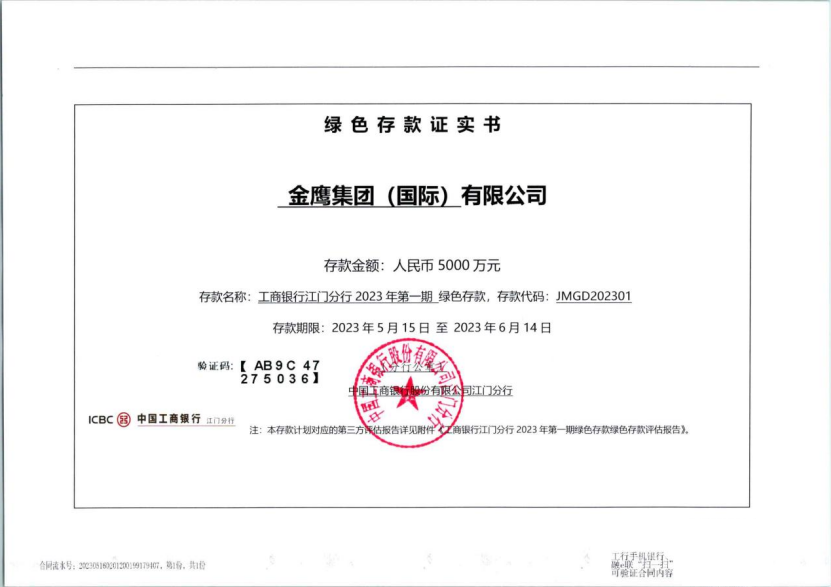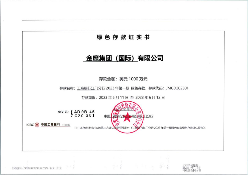 工商銀行江門分行相關(guān)負(fù)責(zé)人表示,與金鷹集團(tuán)開展的全國首筆NRA境外機構(gòu)綠色存款業(yè)務(wù)擴(kuò)大了綠色存款計劃的主體參與范圍和規(guī)模,為環(huán)境友好型企業(yè)引入了新的綠色金融活水,將加快綠色產(chǎn)業(yè)項目建設(shè)進(jìn)度,助力構(gòu)建綠色可持續(xù)發(fā)展格局。