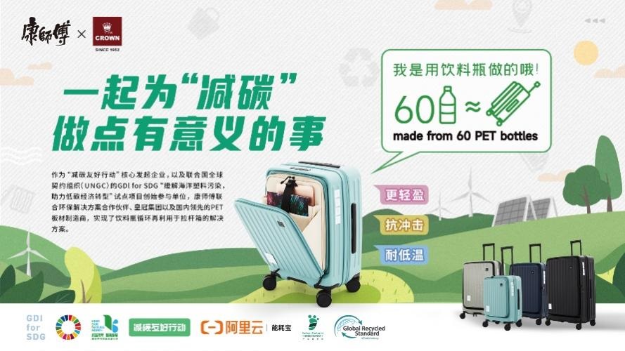 康師傅還作為主要發(fā)起單位之一攜手聯(lián)合國全球契約組織(UNGC)共同發(fā)起了GDI for SDG(全球發(fā)展倡議助力可持續(xù)發(fā)展目標(biāo))的首個試點(diǎn)項(xiàng)目——“緩解海洋塑料污染,助力低碳經(jīng)濟(jì)轉(zhuǎn)型”,與合作伙伴一道將回收的PET等使用后塑料制品,再造為多種生活消費(fèi)品,又通過電商平臺的銷售推廣,實(shí)現(xiàn)循環(huán)利用。在前不久的世界地球日,康師傅與環(huán)保解決方案合作伙伴共創(chuàng),實(shí)現(xiàn)了用康師傅廢棄飲料瓶制作拉桿箱、野餐墊、收納盒等環(huán)保周邊產(chǎn)品。其中聯(lián)合旅行箱品牌CROWN皇冠,共同推出環(huán)保旅行箱,也是在電商很受追捧,成為第一個商業(yè)化的rPET項(xiàng)目。由于應(yīng)用了專利技術(shù),旅行箱使用的回收塑料量大,比現(xiàn)有材料更環(huán)保,而且品質(zhì)更好,無異味,更耐沖擊,耐低溫。這個項(xiàng)目實(shí)現(xiàn)了從塑料循環(huán)利用到商業(yè)價值鏈的良性循環(huán),讓業(yè)界看到循環(huán)經(jīng)濟(jì)模式的曙光。