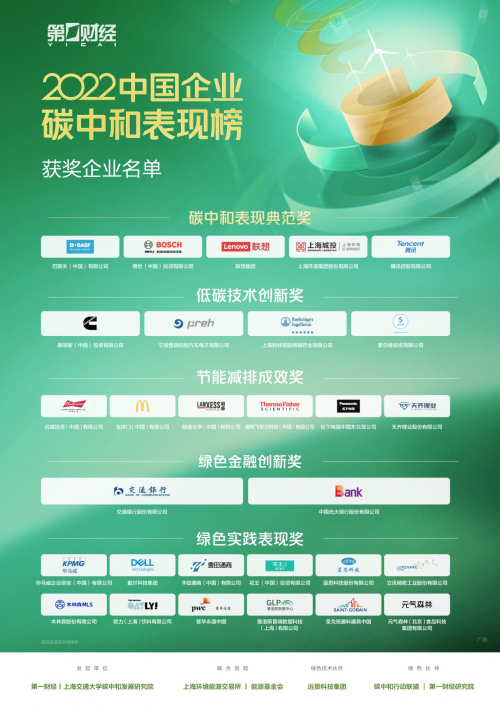 2023年4月22日下午,首屆中國企業(yè)碳中和表現(xiàn)榜頒獎盛典在上海隆重舉行,29家在碳中和進程中表現(xiàn)出色的企業(yè),分獲5大獎項。