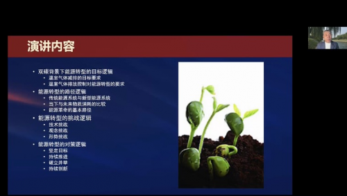 中國能源研究會常務(wù)理事、紅杉中國投資合伙人李俊峰通過視頻演講的形式,從雙碳背景下能源轉(zhuǎn)型的目標邏輯、路徑邏輯、挑戰(zhàn)邏輯、對策邏輯等多個方面著手,分析了《能源綠色轉(zhuǎn)型的邏輯》。