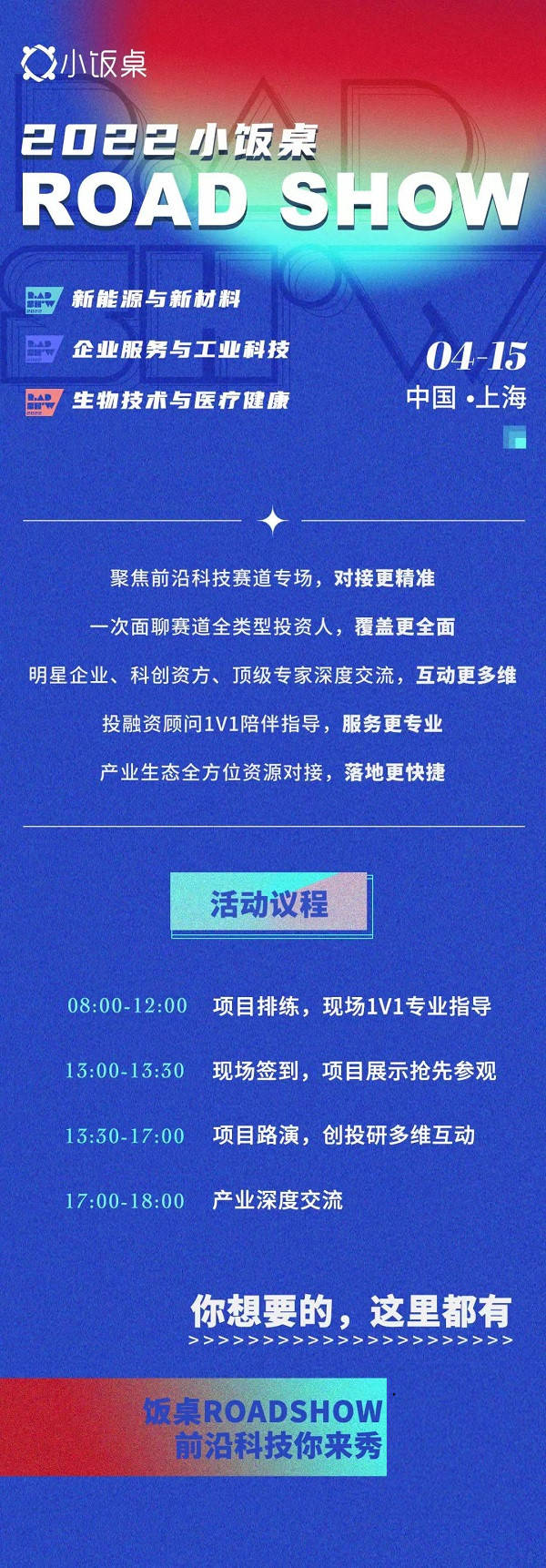 導(dǎo)語:4月15日,2022小飯桌ROASHOW將登陸上海,將開設(shè)“新能源與新材料”、“企業(yè)服務(wù)與工業(yè)科技”、“生物技術(shù)與醫(yī)療健康”賽道專場(chǎng)路演,歡迎各位優(yōu)秀的科技創(chuàng)業(yè)者前來應(yīng)戰(zhàn)!