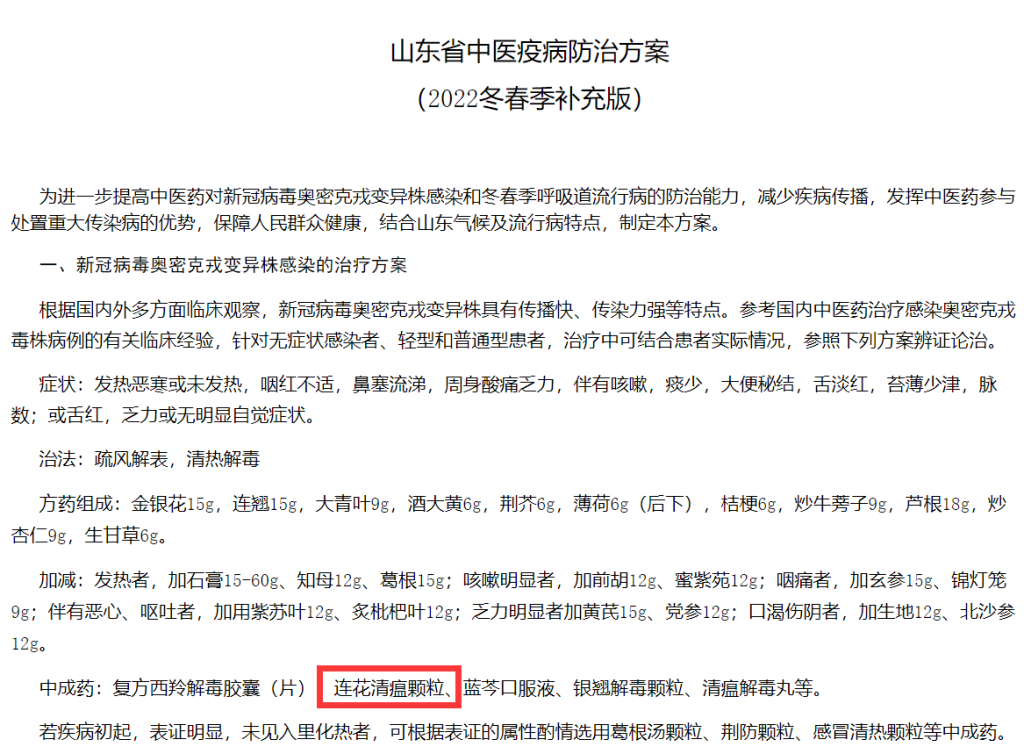 連花清瘟從2003年進入市場至今,已經(jīng)獲得國家層面20余次方案推薦,從甲型流感、乙型流感、禽流感到新型冠狀病毒性肺炎,在這十幾年我國發(fā)生的病毒傳染性重大公共衛(wèi)生事件中,連花清瘟都獲得了治療方案的推薦,成為治感冒、防流感、治療新冠肺炎代表性中成藥。2022年1月《山東省中醫(yī)疫病防治方案(2022冬春季補充版)》中將“連花清瘟顆?!绷袨樾鹿诓《緤W密克戎變異株感染的治療方案推薦中成藥。