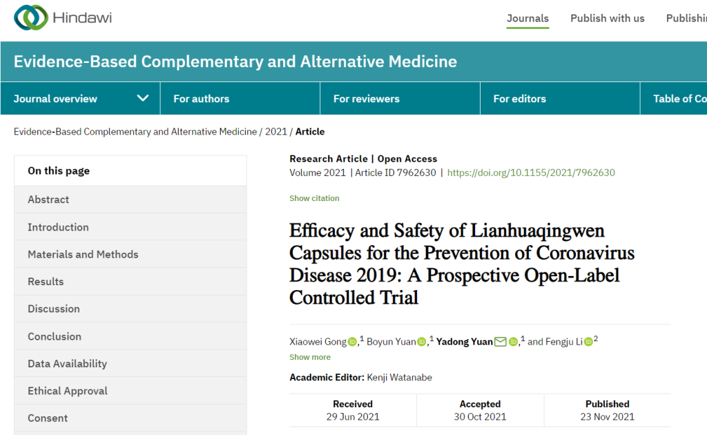 中成藥連花清瘟預(yù)防新冠肺炎研究取得重要進展。近日,由中國河北醫(yī)科大學(xué)第二醫(yī)院呼吸與危重癥醫(yī)學(xué)科、武警河北總隊醫(yī)院醫(yī)學(xué)影像科共同撰寫的科研論文《連花清瘟膠囊預(yù)防新型冠狀病毒肺炎的有效性和安全性研究:前瞻性開放標簽對照試驗》于近日在國際期刊《循證補充和替代醫(yī)學(xué)》發(fā)表,揭示出連花清瘟在預(yù)防新冠感染中的作用,引發(fā)學(xué)界廣泛關(guān)注。