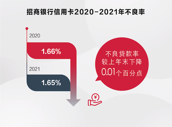近年來,經(jīng)濟(jì)承壓、共債風(fēng)險、監(jiān)管趨嚴(yán)、業(yè)務(wù)收緊等因素使信用卡行業(yè)的風(fēng)險管控面臨較大壓力,但招行信用卡不良率穩(wěn)中有降,風(fēng)險平穩(wěn)可控。據(jù)財(cái)報(bào),2021年,招行信用卡新生成不良貸款292.06億元,同比減少32.35億元,信用卡不良率1.65%,較上年末下降0.01個百分點(diǎn)。