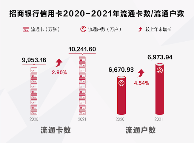 據(jù)財(cái)報(bào),截至2021年底,招行信用卡流通卡量10241.6萬張,較上年末增長2.9%,首次突破1億張;流通戶數(shù)6973.94萬戶,較上年末增長4.54%。招行信用卡流通卡量、流通戶數(shù)在高位穩(wěn)步增長,與其從客戶視角出發(fā)推動產(chǎn)品升級,完善豐富的產(chǎn)品矩陣不無關(guān)系。