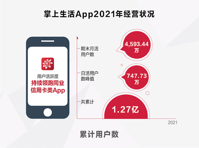 掌上生活A(yù)pp的這些舉措帶來了更高的數(shù)字化獲客水平和用戶增長空間,為優(yōu)化用戶體驗(yàn)、增強(qiáng)用戶黏性提供了有效路徑。截至2021年底,掌上生活A(yù)pp累計(jì)用戶數(shù)1.27億戶,日活躍用戶數(shù)峰值747.73萬戶,期末月活躍用戶數(shù)4593.44萬戶,用戶活躍度居同業(yè)信用卡類App前列。