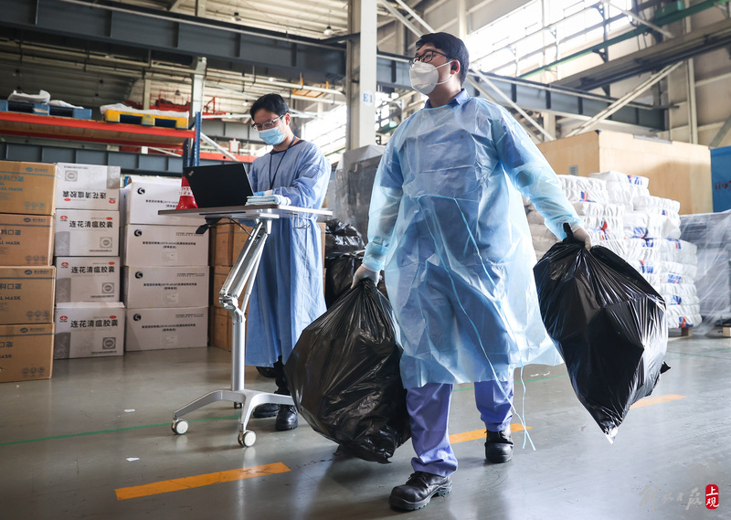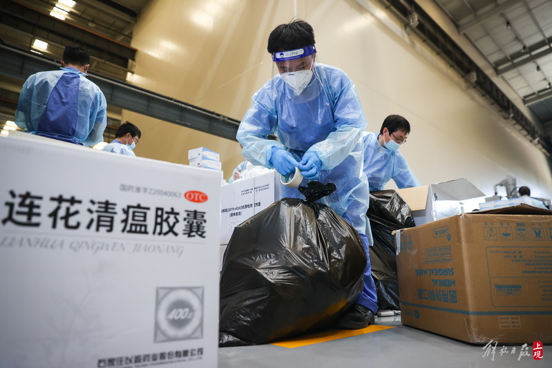 為不增加基層負(fù)擔(dān),寶山區(qū)啟用7個(gè)分揀點(diǎn)對(duì)應(yīng)13個(gè)街鎮(zhèn)園區(qū),由招募來的企業(yè)職工及志愿者流水線作業(yè),對(duì)物資開展卸貨、分裝。