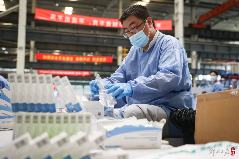 2022年4月11日,上觀新聞?dòng)浾邅淼綐I(yè)績(jī)路上的寶山防疫服務(wù)包最大的分裝車間,這里原本是上海漢虹精密機(jī)械有限公司的生產(chǎn)廠房,但該廠百余名志愿者從早上八點(diǎn)就開始分批次投入到了防疫物資的分裝“流水線”作業(yè)中,一張張清單核對(duì),一件件物資分裝,現(xiàn)場(chǎng)熱火朝天。