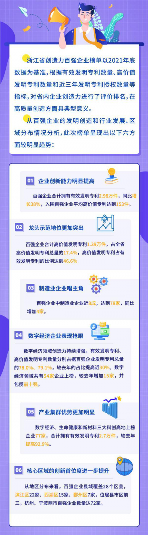 據(jù)悉,該榜單去年起首次發(fā)布,今年以2021年底數(shù)據(jù)為基準,根據(jù)有效發(fā)明專利數(shù)量、高價值發(fā)明專利數(shù)量和近三年發(fā)明專利授權(quán)數(shù)量等指標,對省內(nèi)企業(yè)創(chuàng)造力進行了評價排名。