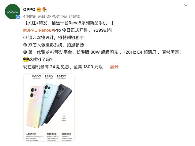 目前,OPPO Reno8 Pro已經(jīng)正式開售,8+128GB版2999元、8+256GB版3199元、12+256GB版3499元,OPPO商城、天貓、京東等線上和OPPO線下門店均有現(xiàn)貨銷售,感興趣的可以了解一下。