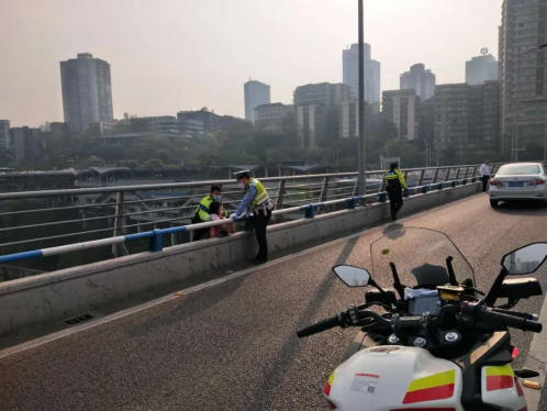 27歲的楊洋是上海英盾保安服務(wù)有限公司駐江北區(qū)公安分局交巡警支隊(duì)摩巡中隊(duì)(以下簡稱“渝警驍騎”)的一名隊(duì)員。2020年4月16日早上08時(shí)30分許,在渝澳大橋附近巡邏的楊洋突然接該支隊(duì)指揮室指令,稱渝澳大橋中間往渝中區(qū)方向有女子輕生。此時(shí)正值上班高峰期,交通堵塞嚴(yán)重。接到指令后的楊洋立馬騎上巡邏摩托車前往事發(fā)地段,在其到達(dá)離事發(fā)現(xiàn)場約10米左右的距離時(shí),看到欲輕生女子已有一只腳跨出橋上欄桿,意欲再翻越欄桿跳下。此時(shí)有兩位民警正在耐心勸說,情況十分危急。