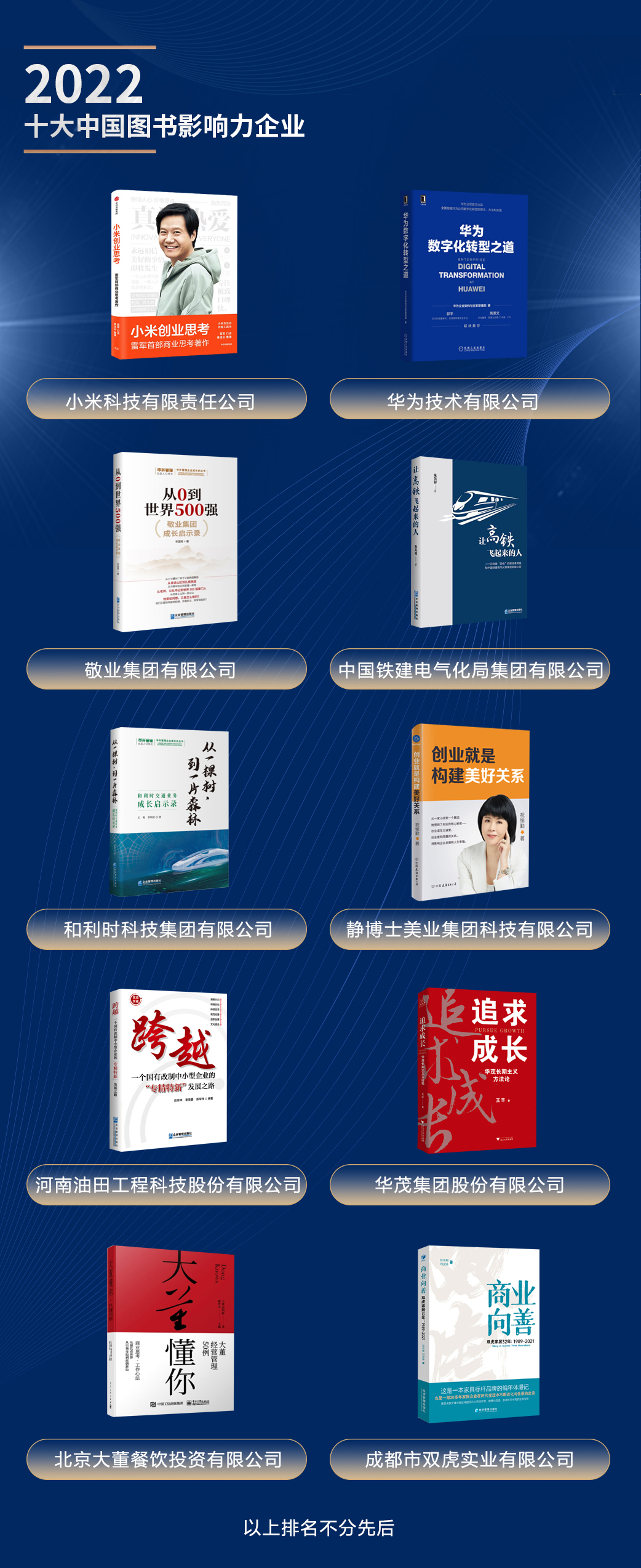 獲得“2022十大中國(guó)圖書影響力企業(yè)”,上榜企業(yè)包括:小米、華為、敬業(yè)、和利時(shí)、靜博士、華茂、大董、雙虎、中國(guó)鐵建電氣化局、河南油田工程科技等。