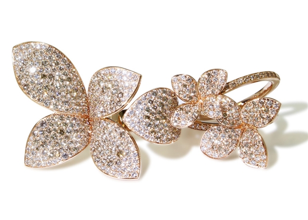 品牌標志性的Giardini Segreti系列,汲取置身米蘭神秘的花園和庭院的靈感,鑲嵌大量白鉆或香檳鉆點綴,流動舒展,好似葉片在風中如花朵紛飛,如蝴蝶般振翅舞動的蛻變之旅。