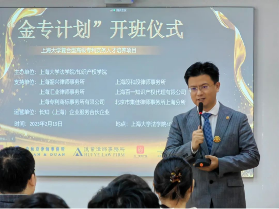 上海段和段律師事務(wù)所知識(shí)產(chǎn)權(quán)中心主任郭國(guó)中為“金專計(jì)劃”開(kāi)班儀式致辭時(shí)表示,非常榮幸參與“金專計(jì)劃”,未來(lái)將致力于培養(yǎng)更多專利代理實(shí)務(wù)人才。