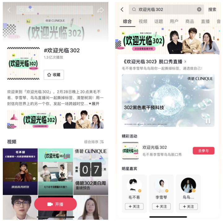 2月28日,由“通透白,通透活”的美白淡斑專家倩碧獨(dú)家冠名的抖音綜藝《歡迎光臨302》上線。