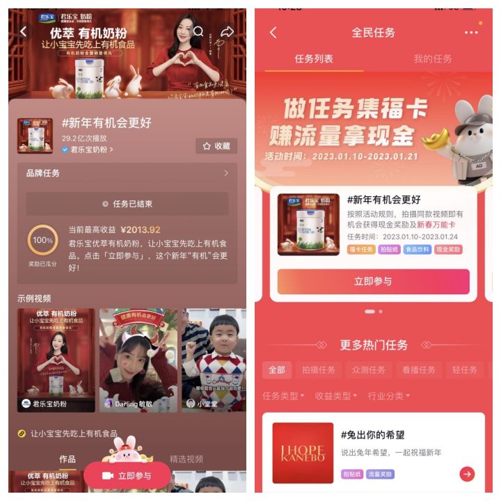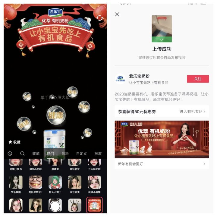 基于新一代母嬰人群所追求沉浸感和參與感,信賴場景式安利、沉浸式感受,因而優(yōu)萃有機奶粉攜手巨量引擎在基礎品牌信息的純曝光宣傳之外,共創(chuàng)了一系列多元互動玩法,如找紅包、集節(jié)氣卡、挑戰(zhàn)賽貼紙等,在點燃新春氛圍的同時加深了品牌與用戶深度互動,尤其是在抖音上發(fā)起的 #新年有機會更好 的話題挑戰(zhàn)賽,優(yōu)萃有機奶粉的有機賣點持續(xù)多次露出,活動各頁面上“優(yōu)萃有機奶粉,讓小寶寶先吃上有機食品”高度吸睛,最大程度覆蓋了用戶目光所及之處,高密度投放且集中化曝光使得優(yōu)萃有機奶粉品牌價值理念在用戶心智中形成深刻記憶點。